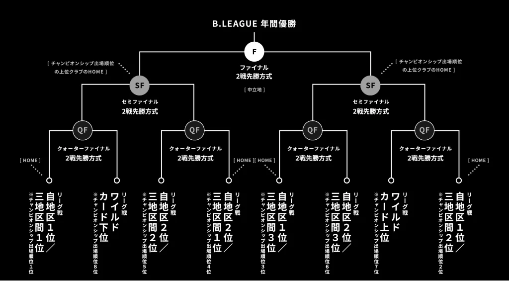 「日本生命 B.LEAGUE CHAMPIONSHIP 2023-24」は、B1リーグ戦における各地区の1位および2位のクラブと、各地区の上位2クラブを除いた18クラブのうち上位2クラブの、合計8クラブのトーナメント方式で開催いたします。